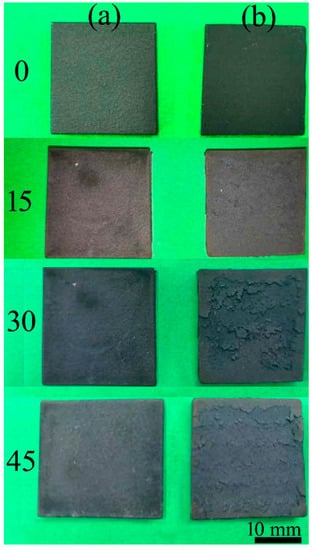 - Wang, B.; Xue, W.; Wu, Z.; Jin, X.; Wu, J.; Du, J. Influence of discharge time on properties of plasma electrolytic borocarburized layers on Q235 low-carbon steel. Mater. Chem. Phys. 2015, 168, 10–17. [Google Scholar] [CrossRef]