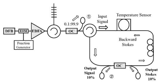 An experimental setup is proposed as shown in Figure 1. The distributed feedback laser (DFB) is modulated by an electro-optical modulator (EOM) which works at the modulating ratio-frequency signal produced by signal generator, then the modulated signal pulse is amplified by the erbium-doped fiber amplifier (EDFA) and filtered by the fiber Bragg grating (FBG). One thousand of the filtered signal pulses output as the reference light by the optical coupler (OC), and the residual signal pulse is rejected into the SBS oscillation cavity through the circulator and induces the occurring of SBS in liquid-filled PCF, then the backward Stokes light occurs and propagates counterclockwise in the oscillation cavity. Here the frequency of the signal light is higher than the that of Stokes light and matches with , thus the Stokes light can be regarded as the pump light and the signal light acts as the anti-Stokes light whose pulse is advanced when transmitting along the liquid-filled PCF. The time advancement of the signal pulse can be obtained and measured by comparing the 10% output signal light from the OC-2 with the 1‰ input signal from the OC-1. The polarization of the signal light and the Stokes light are controlled by the polarization controller (PC) so as to achieve the maximum time advancement of the signal light. Due to the different refractive index of the liquid-filled PCF at different temperatures, the effective mode field areas and the Brillouin absorption coefficient are different, thus leading to the different time advancement of the signal light, so temperature sensing can be implemented by varying the time advancement of the signal light.