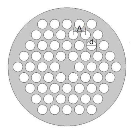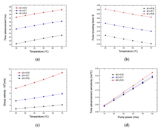 The cross profile of the PCF which has four hexagonal rings of air-holes is shown in Figure 2. is the air-hole diameter, is the distance between adjacent two air-holes and is defined as the air filling factor (AFF). In this paper is and is set as 0.6, 0.7 and 0.8 respectively for different d. We set the pump power as 20 mW, the pulse width of the signal wave is 200 ns, and the wavelength of the pump wave is 1550 nm. Due to the melting point (−114.3 °C) and the boiling point (78.4 °C) of alcohol, the sensing temperature is set between 20 °C and 70 °C for this alcohol-filled fiber, and some key parameters for SBS fast light are described at this temperature range in this paper.