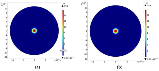 Distribution of acoustic fundamental mode in the proposed (a) filled and (b) unfilled PCF at 20 °C.