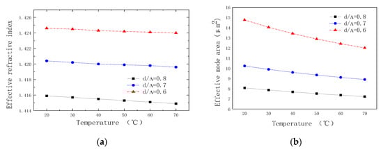 The variation of the effective refractive index of the PCF with different temperature and different AFF is shown in Figure 5a. The effective refractive index reduces when increases at a given temperature. Compared to the change of quartz index with different temperature, the alcohol index changes largely and thus induces varying of the difference of the effective refractive index for the different temperatures. Figure 5b shows the effective mode field area varying with temperature in the filled PCF. It can be seen that the larger the is, the smaller the effective mode field becomes, and when temperature goes up the effective mode field area gradually shrinks because of the reducing of the alcohol index with temperature rising. The effective mode field area variation reaches to while is 0.6 at the temperature range of 20–70 °C.