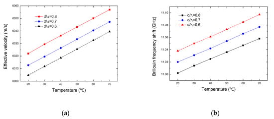 Figure 6 shows the variation of the effective acoustic velocity and the Brillouin frequency shift with temperature. It can be seen from Figure 6a that the effective acoustic velocity increases gradually with the rising of temperature, and there is a larger effective acoustic velocity corresponding with high , this is because the effective refractive index decreases with the rising of temperature or with the increasing of . Meanwhile these result in a small Brillouin frequency shift, which can also be seen from Figure 6b. The Brillouin frequency shift is different at about 11 GHz and the average difference per unit temperature is 1.15 MHz.
