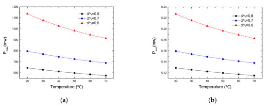 Because the Brillouin absorption coefficient of the filled PCF is different at different temperatures, the Brillouin threshold value at different temperatures can be obtained from the Equations (11) and (12). Figure 7 depicts the changes of and at different and temperature. When increases, both , and their modifications reduce. Since larger confine the transmission light into smaller regions to reduce SBS occurring in the area in the PCF, and for the same reason, the SBS occurs easily due to the shrinking of the effective mode field area as the temperature rises. The simulation result shows that the range of is from 913 mW to 1137 mW and the range of is from 0.18 mW to 0.23 mW while the effective transmission length is 10 m and is 0.6.