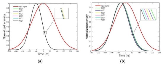 Figure 9 describes the normalized signal pulse shape of the fast light. The black curve illustrates the pulse of the input signal light whose width is 200 ns. It can be seen that the shapes of the output signal pulses are narrower than the input pulse shape. Because the signal pulses are compressed in the fast light process, and the compression is more easily distinguished because of the larger time advancement due to higher temperature in alcohol-filled PCF. The signal pulses at different temperature are nearly overlapped in unfilled PCF as shown in Figure 9a, however they are clearly separated in the filled PCF as shown in Figure 9b.