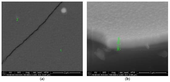 3 was approximately 22.75%. On the layer surface, fair and dark areas, as well as cracks are visible. These cracks were formed during sample breaking for microscopic tests. The fair areas are aggregates of a large number of crystalline grains about 600 nm in size. These aggregates were probably formed on convex fragments of the substrate, i.e., where fragments of incompletely melted quartz sand have remained [