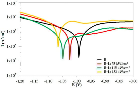 | B + L (76 kW/cm2) | 2.91 × 10−6 | −1.02 × 10+0 |