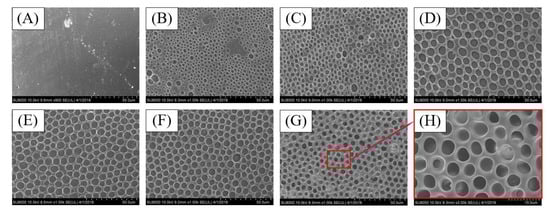 SEM images of PS/SBS porous films formed at different volume ratios of water/ethanol. (A) 1:0, (B) 10:1, (C) 8:1, (D) 6:1, (E) 4:1, (F) 3:1, (G) 2:1, (H) 2:1. Other factors: concentration 70 g/L, weight ratio of PS/SBS 3:1.