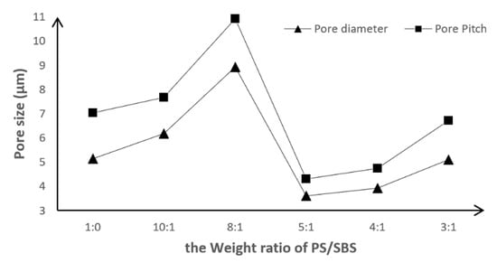 The weight ratio of PS/SBS exerts an enormous impact on porous films formation. In order to investigate the influence of weight ratio on the PS/SBS, we prepared the PS/SBS chloroform solutions with different weight ratio (1:0, 10:1, 8:1, 5:1, 4:1, 3:1, 2:1, 1:1, 1:2, 1:3, 1:4, 1:6, 1:8, 1:10, 0:1) of PS/SBS, the concentration of the solutions is 50 g/L and the volume ratio of the water/ethanol is 3:1. As shown in Figure 4, in the PS/SBS blending system, with a little addition of SBS (Figure 4B), the structures are disordered compared to the no-SBS system (Figure 4A) but they become more regular, and also the pole size is reducing with the further addition of the SBS (Figure 4C–F). However, when the weight ratio of PS/SBS is less than 3:1, the structures become disordered again with the increase of the SBS (Figure S3A–C); when the ratio is less than 1:1, the structures are not regular at all (Figure S3D–I). It is worth mentioning that when the weight ratio of PS/SBS is 5:1, there is some parts of the holes are “missing” (Figure 4D). As shown in Figure 5, the average pore diameter and pore pitch increase with the adding SBS in two intervals, 1:0 to 8:1 and 5:1 to 3:1; but the pore size of later interval is less than the former’s.