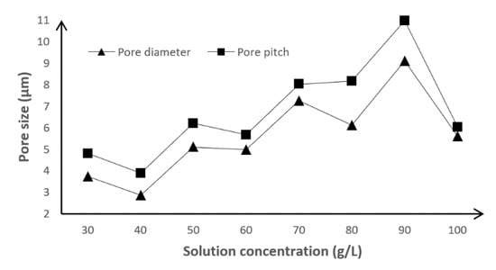 The concentration of the spreading solution can strongly influence the morphologies of the films’ surface features. The concentration’s influence on the porous films formation was investigated by changing the concentration of PS/SBS chloroform solution, which was from 10 g/L to 100 g/L. The weight ratio of PS/SBS was 3:1 and so did the volume ratio of the water/ethanol. As shown in Figure 6, the structure of the films is well-ordered when the concentration of solution is lower than 60 g/L, after that, the structure is becoming more and more disorder with the increase of the concentration, which indicates that concentration of the solutions influences the film’s formation greatly. The average pore diameter and pore pitch show a general ascending trend which is from 2.73 µm to 7.26 µm for pore diameter and 4.29 µm to 8.26 µm for pore pitch when the concentration is lower than 100 g/L (the pore size decreases sharply) and with the fluctuate at 40 g/L and 60 g/L (Figure 7). However, it is noteworthy that there is no film formation when the concentration of the solution is lower than 30 g/L.