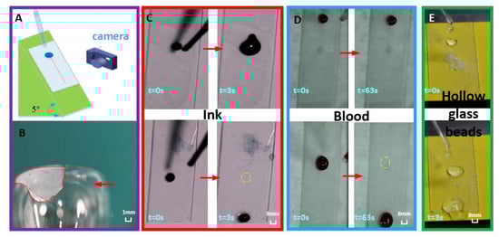 The glass surfaces with and without the lubricant were fixed at a tilting angle 5°, then dipped in 0.5 mL of different pollutants (ink, blood). As can be seen from Figure 8C,D, after different times from the beginning pollutants were trapped in the dry films but moved to the bottom of the surface of the films; pollutants (hollow glass beads) were easily washed away by water on the surface of the films as shown in Figure 8E, which implies that the films have an excellent self-cleaning function which could be used in the areas such as endoscopes.