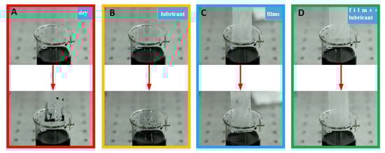 In order to compare the effects of film structure and lubricants on self-cleaning properties, four types of surfaces with differently processed were immersed in a beaker containing ink for about 3 s, respectively and then were taken out. Fierce contrast can be observed from Figure 9 that the composite surface of the film dealt with the lubricant shows marvelous self-cleaning ability.