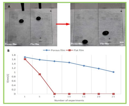 The durability of self-cleaning function of the porous films was investigated by contrasting the sliding speed of the ink droplet on surfaces between wet porous film and wet flat film and the results were shown in Figure 10. As illustrated in Figure 10A, an ink droplet on the porous film surface slides faster than that on flat film surface which verified the analysis above that the micropores on the surface are beneficial to enhance the slippery performance. Even though the surface with a flat film could also maintain good lubricity in previous experiments, however, as the number of experiments increased, the lubricating fluid was also consumed by the droplets. Therefore, after several experiments, it was difficult to slide down the inclined surface and the self-cleaning performance also weakened notably, as shown in Figure 10B. It can be proved that the structure of the porous film can trap the lubricating fluid compared with the structure of the flat film, and the lubricating durability is better and then the self-cleaning performance is also maintained.