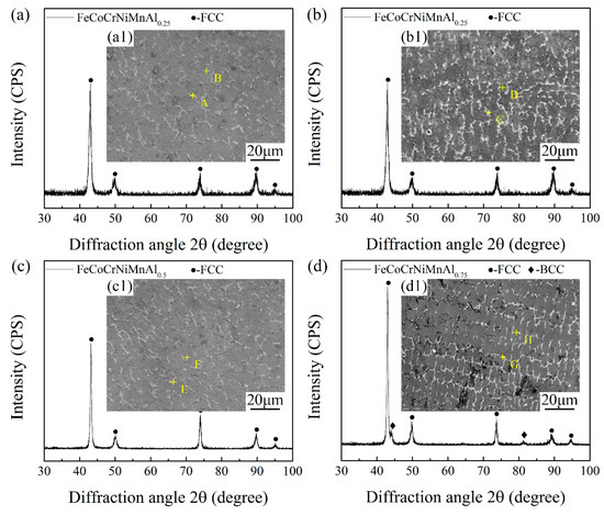 XRD detection results and microstructure of the FeCoCrNiMnAlx cladding layers: (a,a1), x = 0; (b,b1), x = 0.25; (c,c1), x = 0.5; and (d,d1), x = 0.75.