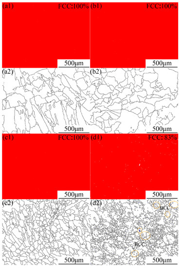Grain boundaries and phase distribution of FeCoCrNiMnAlx cladding layers were detected by EBSD, and the results are shown in Figure 2. The FCC phase uniformly distributed in the cladding layers when the contents of Al element were 0, 0.25 and 0.5 mol, respectively. The BCC phase structure appeared in the FeCoCrNiMnAl0.75 cladding layer, and it is located at the grain boundaries, as shown in Figure 2d2.