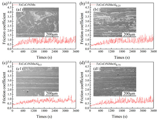 Friction coefficient curves and wear morphologies of the FeCoCrNiMnAlx cladding layers after 600 °C high-temperature wear tests: (a,a1) x = 0; (b,b1) x = 0.25; (c,c1) x = 0.5; and (d,d1) x = 0.75.