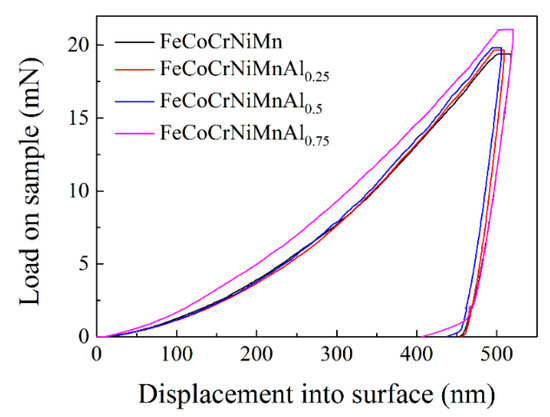 Load-displacement curves of the FeCoCrNiMnAlx cladding layers after the nano-indentation test.