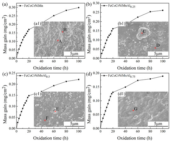 Oxidation mass gains and microstructures of surface oxides of the FeCoCrNiMnAlx cladding layers: (a,a1) x = 0; (b,b1) x = 0.25; (c,c1) x = 0.5; (d,d1) and x = 0.75.