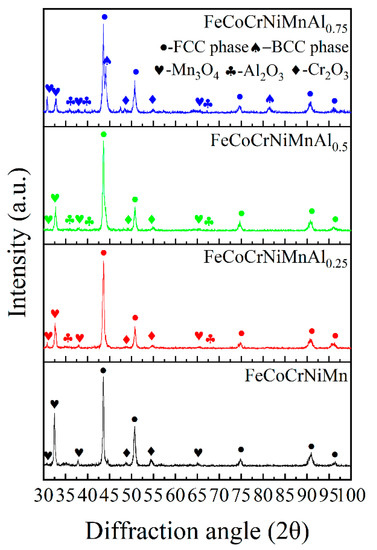Moreover, dendritic morphologies can be observed on the surface of FeCoCrNiMnAlx cladding layers, as shown in Figure 1a1–d1. The average grain sizes of the four coatings are 10.37, 8.61, 7.54 and 5.32 μm, respectively, indicating that Al element has the effect of refining grains. EDS detection results of dendritic and interdendritic spaces of FeCoCrNiMnAlx cladding layers are listed in Table 2. Interdendritic space in the FeCoCrNiMn cladding layer contained more Cr elements than dendritic spaces. The distribution patterns of alloying elements in the remaining cladding layers were basically similar, that is, the content of Cr and Al elements in the interdendritic space were higher, while the dendritic space contained more other four alloying elements (Fe, Co, Ni and Mn).