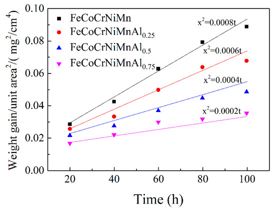 where x is the oxidation mass gain per unit area, a is the parabolic velocity constant of the oxidation reaction (the rate of oxidation) and t is the oxidation time. Oxidation kinetic data of the four HEA coatings at the slow oxidation stage are put into Equation (3) for linear fitting, and the results are shown in Figure 7. The relationships between the square of oxidation mass gain and the oxidation time are approximately linear. The oxidation mass gain rate of the FeCoCrNiMnAl0.75 cladding layer was lower than those of other cladding layers, which further proved that the FeCoCrNiMnAl0.75 cladding layer had a better high-temperature oxidation resistance capability.