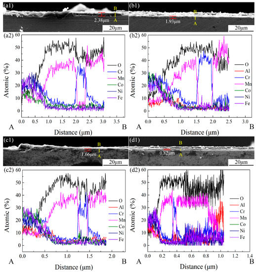 The oxide film thicknesses of the FeCoCrNiMnAlx cladding layers were 2.38, 1.93, 1.66 and 0.82 μm, respectively, as shown in Figure 8a1–d1. The oxide film of the FeCoCrNiMn cladding layer exclusively contains Cr and Mn elements, while Co, Ni and Fe elements are undetectable, as shown in Figure 8a2. The oxide film can be divided into two layers: a thicker Mn-rich outer layer and a thinner Cr-rich inner layer (near the bottom of the HEA cladding layer). The Al element began to distribute in the oxide films of the FeCoCrNiMnAl0.25 and FeCoCrNiMnAl0.5 cladding layers, and the content was increasing gradually, as shown in Figure 8b2,c2. The oxide film on the surface of the FeCoCrNiMnAl0.75 coating could be divided into three layers: a Cr-rich inner layer, a Mn-rich middle layer and a thinner Al-rich outer layer, as shown in Figure 8d2.