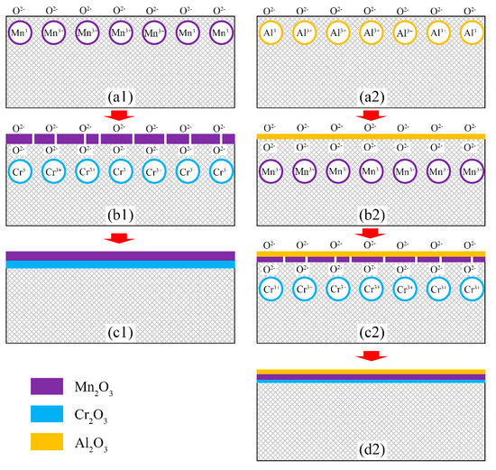 The Al2O3 oxide has a lower Gibbs free energy (−373.75 kJ/mol) than those of Cr2O3 and Mn2O3 oxides [26]. The Al2O3 oxide was preferentially formed and rapidly grew on the surface of the cladding layers, as shown in Figure 9b2. The necessary conditions for the formation of the continuous dense oxide film are as follows: the volume of metal oxide film formed on the metal surface is larger than the volume of metal elements consumed to generate these oxide films, which is called Pilling-Bedworth Ratio (PBR) [28]. The PBR value of Al2O3 (1.28) is suitable among the oxides formed on the surface of the cladding layers; thus, a continuous dense oxide film effectively protected the cladding metal [29]. As the oxidation process continued, a few O atoms entered the areas between the cladding layer and Al2O3 oxidation film to react with Cr and Mn atoms, and then the middle film (i.e., Mn2O3 oxide) and inner film (i.e., Cr2O3 oxide) were formed, as shown in Figure 9d2. Moreover, transient Cr2O3 was used as a nucleated particle of the steady Al2O3 due to the same corundum crystal structure of these two oxides [30]; thus, formation of Al2O3 oxide in the oxidation process was further accelerated [31].