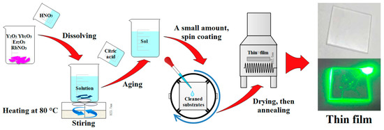 A Y2O3–Rb (with Yb3+ and Er3+) precursor was prepared using a sol-gel method. All chemicals were used directly without further purification. The preparation process is shown in Figure 1.