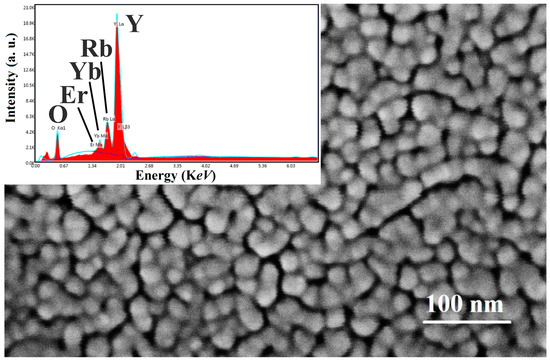 The surface morphologies of the samples were characterized by SEM. All the samples had almost the same surface morphology, and only sample Rb-5 is given as a representative in Figure 2. Meanwhile, the chemical composition analysis of sample Rb-5 with an EDS spectrogram is given in the inset in Figure 2. The surface of the film is compact, crystallized well, and composed of round nanoparticles. As shown in the inset in Figure 2, the Y3+ characteristic peak at 2.0 keV is the highest, and other elements’ characteristic peaks are also clearly shown in the spectrum, which means that the main phase should be Y2O3, and Rb+-doped Er3+/Yb3+–Y2O3 films can be obtained.