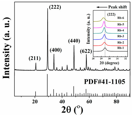 XRD patterns of sample Rb-5. The inset is the shift of the main diffraction peaks (222) of the samples.