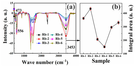 (a) FTIR spectra of the samples; (b) the curve of the normalized peak strength area integral of the samples.