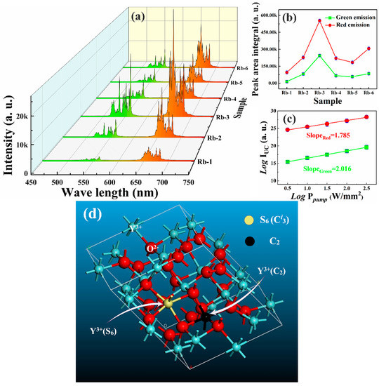 (a) Effect of Rb+ on the photoluminescence (PL) spectra; (b) the main peaks’ area integral of the spectra; (c) dependence of luminescence intensity on pump power (Rb-3); (d) Y2O3 lattice diagram.