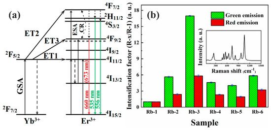As can be seen in Figure 8b, the emission intensifications of green and red are different, which indicates that the distribution of excited ions in energy levels changes. According to the energy level transition mechanism, generally, there are two factors that cause the change of excited ion distribution, phonon energy and the distance between rare earth ions. The Raman spectra of the samples were tested, which shows a similar profile as shown in the inset in Figure 8b, indicating that Rb+ doping has no effect on the phonon energy of the samples [28]. Therefore, the distance change between rare earth ions is the main reason for the linear change of color coordinates. As discussed in fluorescence lifetimes, the energy transfer efficiency can be increased by decreasing the distance between Yb3+ and Er3+ caused by Rb+ doping, which indicates that the distribution of excited ions in energy levels can be changed by Rb+ doping. As shown in Figure 8a, the green emission comes from the 4F7/2(Er) level, and the red emission comes from the 4F7/2(Er) and ET3 process. When color coordinates move to the green region from the red region by increasing the Rb+ doping concentration, the green emission gets more enhancement amplitude, which indicates that there are more excited ions located in 4F7/2(Er) compared with 4F9/2 levels. By using Rb+-doped films, energy transfer efficiency between Yb3+ and Er3+ can be improved, and the preferential distribution of excited ions in the 4F7/2(Er) level is obtained.
