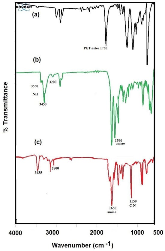 The chemical structures of APA and PAIIL were confirmed from FTIR, 1HNMR, and 13CNMR analyses as represented in Figure 2, Figure 3 and Figure 4. The FTIR spectra of PET, APA and PAIIL were summarized in Figure 2a–c. The appearance of new bands at 1650 and 1560 cm−1 referred to amide type (I) and (II) vibrations in FTIR spectra of APA (Figure 2b) and PAIIL (Figure 2c) confirms the formation of terephthalamide unit instead of terephthalate. Moreover, the presence of two bands at 3550 and 3450 cm−1 attributed to NH2 stretching vibration of APA spectrum (Figure 2b) elucidates the presence of NH2 groups in its chemical structure. The appearance of less intense band at 3635 cm−1 in PAIIL spectrum (Figure 2c) confirms the lowering of NH2 contents due to formation of imidazolium ion. However, the presence of absorption bands from 2800 to 3200 cm−1 in the PAIIL spectrum (Figure 2c) assigned of methylene and CH stretching from 2800 to 3000 cm−1 and attributed to +N=C–H stretching vibrations mode of imidazolium ring cations [30]. The new intense band at 1150 cm−1 in spectrum of PAIIL (Figure 2c) was attributed to C-N bending of imidazolium cation. The acetate anion band C=O stretching was observed at 1600 cm−1 in FTIR spectrum of PAIIL (Figure 2c).