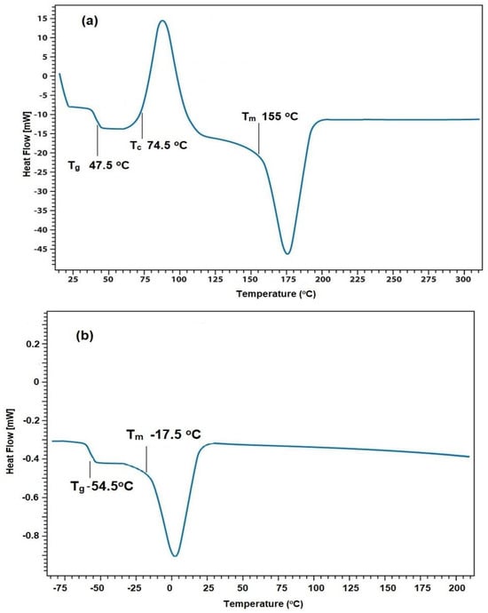 The thermal characteristics of APA and PAIIL were investigated from their DSC thermograms represented in Figure 5a,b, respectively. It is reported that PET thermoplastic polymer has three temperature transitions as glass transition (Tg), crystallization (Tc), and melting (Tm) temperatures that determined as 79.8, 148, and 230.6, respectively [32]. The APA thermogram (Figure 5a) shows the same characteristics of Tg, Tc, and Tm at 47.5, 74.5, and 155 °C, respectively. The PAIIL thermogram (Figure 5b) shows only Tg and Tm at –54.5 and –17.5 °C to elucidate the formation of IIL with low Tg and Tm values. The disappearance of Tc from the PAIIL (Figure 5b) and appearance in APA (Figure 5a) thermograms proves the disordering and ordering of the surface layer of crystals, respectively. The surface layer of PAIIL melts gradually prior to the bulk melting point due to formation of quasi-liquid to dissolve its crystallinity [33].