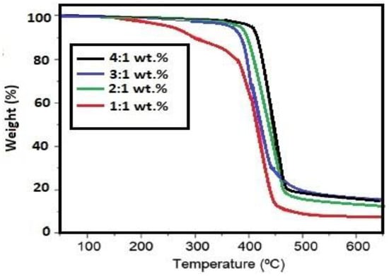 Thermal stability of the cured DGEB epoxy resin with different weight ratios of PAIIL (DGEB/PAIIL; 4:1, 3:1, 2:1, and 1:1) was investigated from TGA thermograms represented in Figure 8. It was found that the initial degradation temperature (IDT) was reduced with increasing PAIIL concentrations (DGEB/PAIIL; 1:1) that decomposed at 180 °C. Moreover, The IDTs of DGEB/PAIIL; 4:1, 3:1, and 2:1 are 380, 300, and 350 °C, respectively. These data elucidate that the increasing of PAIIL contents (1:1) produces high acetic acid contents (Scheme 3) that increases the degradation rate of polymer chains and IIL [38]. It was also observed that the residual content % (RS%) above 550 °C was reduced with increasing the PAIIL contents to confirm that the char formation is produced due to complex dehydration reaction that was decreased with increasing acetate contents. The higher thermal stability of DGEB/PAIIL 4:1 and 2:1 than 3:1 (Figure 7) indicates that both 4:1 and 2:1 form moderate and higher crosslinking densities more than 3:1, attributed to heterogeneity of epoxy networks [39]. The lowering thermal stability of DGEB/PAIIL 3:1 than 4:1 or 2:1 could be attributed to the homogeneity of the crosslinked networks besides degradation of chains and forming of chains at higher degradation temperature [40]. This observation agrees with the lowering RS% of DGEB/PAIL in the order 1:1 < 2:1 < 3:1 < 4:1 as 6, 14, 21, and 23 wt.%, respectively (Figure 8).