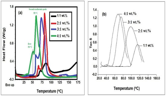 The flexibility or rigidity of the cured DGEB epoxy resin with different weight percentages of PAIIL (DGEB/PAIIL; 4:1, 3:1, 2:1 and 1:1) were determined from DSC and DMA measurements represented in Figure 9a,b, respectively. It is very important to use lower heating rates for DMA (2 °C min−1) than DSC (5 °C min−1) due DMA analysis sensitivity that usually uses relatively much bigger sample than DSC. So, the DGEB/PAIIL sample has enough time to reach thermal equilibrium with the chamber environment with the heating rate 2 °C min−1. Moreover, the heating rate 5 °C min−1 was selected as preferred slow heating rate for dynamic non-isothermal DSC analysis to reflect the intrinsic nature of the curing process, like the apparent activation energy and frequency that are very important for investigating the relationship between the properties and structures of thermosetting epoxy resin [41]. The glass transition temperatures (Tg) and the total heat of the curing reactions enthalpy (ΔH; J g−1) of; 4:1, 3:1, 2:1, and 1:1 wt.% were determined from their area under peaks of DSC thermograms (Figure 9a) and summarized in Table 1. The presence of shoulder peak before the second exothermic peak in all curves (Figure 9a) confirms the presence of two curing reaction mechanisms as represented in Scheme 2 and Scheme 3 [35]. Moreover, the order of curing reactions of DGEB/PAIIL at lower temperatures was arranged in the order 4:1 > 3:1 > 2:1 > 1:1. The DMA analysis determined in terms of variation tanδ versus temperature of all cured DGEB/PAIIL epoxy resins (Figure 9b and Table 1) shows the same results of Tg that determined from the maximum of the tanδ peaks. These mean that the increasing of PAIIL (wt.%) produces rigid networks with increasing Tg which may be referred to decomposition of PAIIL due to large amounts of acetic acids produced the curing of DGEB/PAIIL weight ratio (1:1) to decrease the plasticizing effect of imidazolium cations [35,36,37]. The Tg data of the DGEB/PAIIL determined from DMA were increased than that determined from DSC experiment were attributed to the higher temperatures used to DSC under dynamic mode. This difference can be referred to the cooling to −30 °C, heating to 300 °C and cooling of DGEB/PAIIL under non-isothermal mode in DSC technique. DMA specimens are tested under dynamic conditions under heating up to 200 °C.