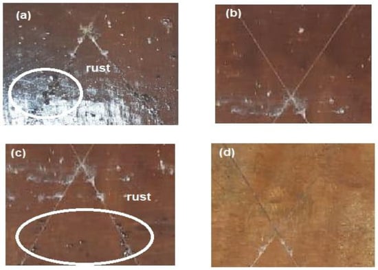 The corrosion resistance of DGEB/PAIIL coatings against seawater fogs and humidity was investigated from salt spray resistances measurements as summarized in Figure 11a–d and Table 3. The formation of rust under coatings is responsible for the adhesion failure between the epoxy coatings and steel (Figure 11a–d). The rusts occurred under coatings early for DGEB/PAIIL 1:1 and 3:1 after exposure to 500 and 1000 h, respectively (Figure 11a,c). The higher salt spray resistances of DGEB/PAIIL weight ratios 4:1 and 2:1 extended to 1500 h (Table 3 and Figure 11b,d). This improvement was attributed to the formation of superior homogeneous cured epoxy resins having high adhesion with steel to act as a barrier to salt, water, and oxygen from the aggressive environment [42,43].