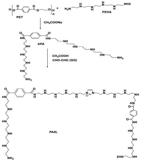APA (0.5 mol) was dissolved into acetic acid aqueous solution (100 mL; 50 vol.%) and GO (0.025 mol; 1.45 g) was added to the mixture at temperature −4 °C. The reaction temperature was increased up to 70 °C for 5 h and cooled for purification by washing with diethyl ether several times. The unreacted GO, acetic acid, and water were removed by using rotary evaporator under vacuum to obtain colorless liquid 1,3-bis(1-(4-(14-amino-3,6,9,12-tetraazatetradecyl) carbamoyl) phenyl)-1-oxo-2,5,8,11, 14-pentaazahexadecan-16-yl)1,3-imidazolium acetate (PAIIL). The yield of PAIIL product was 95% yield percentage.