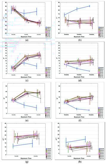 - Pánek, M.; Reinprecht, L. Colour stability and surface defects of naturally aged wood treated with transparent paints for exterior constructions. Wood Res. 2014, 59, 421–430. [Google Scholar]