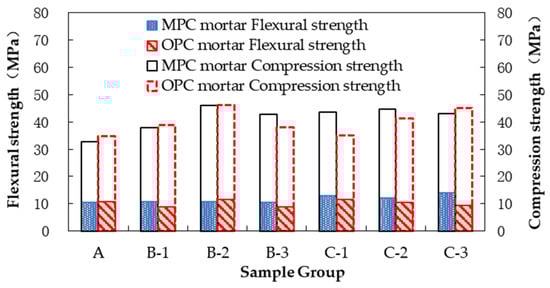 Figure 1 shows the measured flexural and compressive strength of the MPC mortar and OPC mortar in each group. In general, the compressive strength of the prepared MPC mortar and OPC mortar was distributed in the range of 35–45 MPa, and the flexural strength was distributed in the range of 9.5–11.5 MPa. Based on the test strength value, the change in flexural strength between the mortars with different mineral admixtures and poured fibers was small, but the compressive strength of the two kinds of mortar was obviously improved by mixing silica fume and fly ash, as well as glass fiber and basalt fiber.