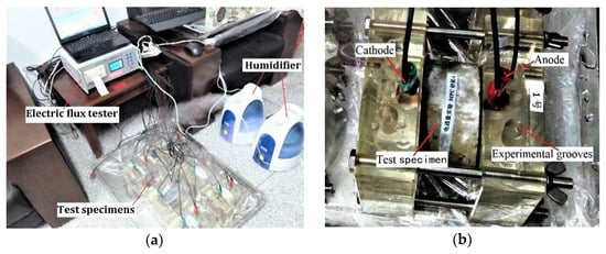 Test device for electrical capacity: (a) test device; (b) test specimens and experimental grooves.