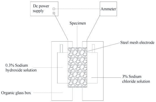 The electrical flux method was applied to determine the chloride ion penetration resistance of the concrete by testing the electrical flux in concrete. The working principle is presented in Figure 3.