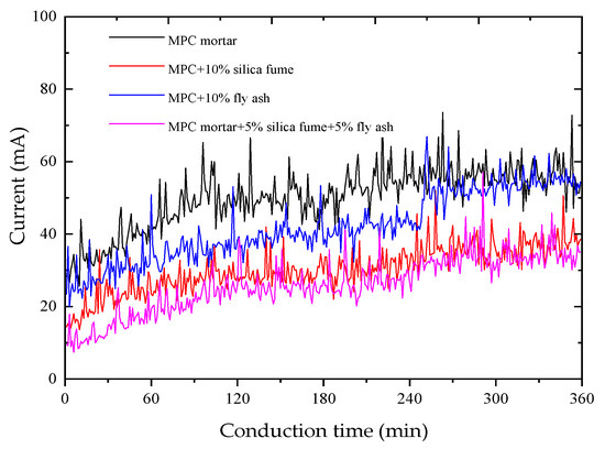 Figure 4 presents the time–history curve of the current (in milliamperes) measured in the experiment. It can be seen that the amplitude of the current varied greatly in the experimental process. Because the experimental process was controlled by computer programs, the potential of 60 V was kept constant. Therefore, the fine holes in the mortar matrix made the negatively charged ions migrate to the cathode rather smoothly. Moreover, in the first 100 min, the movement of negative ions in the pores increased gradually, and the current gradually increased in the initial stage. As seen from the time–history curve of the current, mixing SF and FA can reduce the amplitude of the current in the mortar. The particle size of the SF is smaller than that of the FA. The micro aggregate effect of the SF thus makes the mortar matrix more compact and better for clogging the fine pores. The current value was obviously lower than that of the MPC mortar with powder coal ash, and the measured electrical flux is presented in Figure 5. It is also shown that the use of FA reduced the electrical flux of the MPC mortar and OPC mortar by 15.3% and 21.8%, respectively, while reductions of 64.4% and 36.3%, respectively, we observed when using the SF. Notably, the combined use of SF and FA reduced the electrical flux of the MPC mortar and OPC mortar by 79.6% and 59.1%, respectively, showing a better permeability effect. This is because a better graded mixed micro aggregate was formed when using a combination of SF and FA, which helped reduce the connective pores and clog the fine pores.