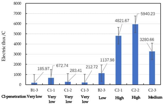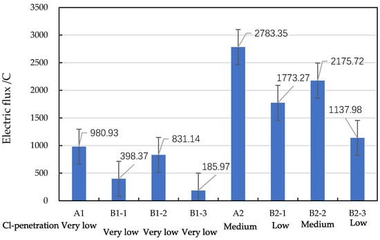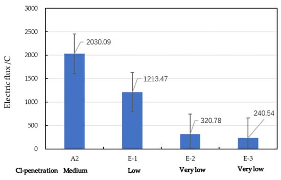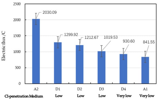 Chloride ion penetration was evaluated in accordance with ASTM 1202 [29], as presented in Table 7.