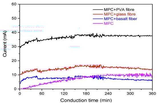 Figure 7 shows the effects of three kinds of fibers, including PVA fiber, glass fiber, and basalt fiber, on the electrical current in the electrical flux experiment of the MPC-based material. The trend of the current development curve shows that the currents of the PVA fiber and MPC mortar were relatively large, while the current of the basalt fiber and MPC mortar was relatively small. The characteristics of the current change show that the MPC hardened body quickly reached a relatively stable current value at the beginning of the electrifying stage but was different from the MPC mortar without fibers, which experienced a development process featuring the gradual opening of fine pores and an increase in current value. It can be seen that the addition of fibers increased the number of pores and capillary pores in the hardened MPC mortar, which made the anion move smoothly due to the potential difference.