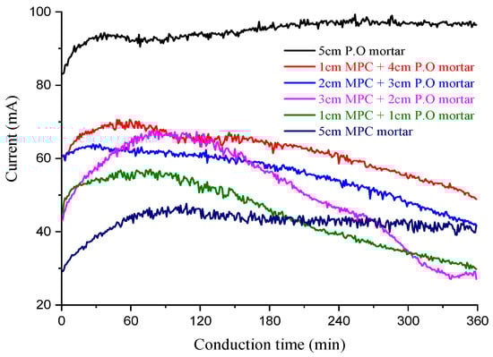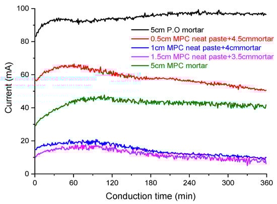 Figure 10 was drawn according to the tested current value. This figure demonstrates that casting 1 cm MPC mortar using the OPC slurry can significantly decrease the current, while an increase in MPC mortar thickness can produce a further decrease in the current. Unlike the single material, an increase in the power time will result in a distinct decrease in the current through the bilayer material. The MPC mortar with a thickness of 1 cm decreased the current by 36%. As the thickness of the MPC mortar increased, the descending rate of the current decreased.