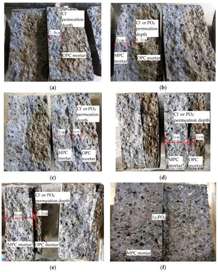 After the electrical flux test, the specimens were immediately split and sprayed with an AgNO3 solution at a concentration of 0.1 mol/L. The appearance of the specimens is shown in Figure 6. The cross section of OPC mortar along the thickness of the cement mortar features white AgCl precipitation, and the OPC mortar section with admixture is white-stratified. The stratified powder coal was relatively thick, with hardly color across the section of MPC-based materials because of the presence of phosphate ions. Therefore, the electrical flux method is more suitable than the RCM method (using a silver nitrate indicator to distinguish chloride permeability) to test the chloride permeability resistance of magnesium phosphate cement.