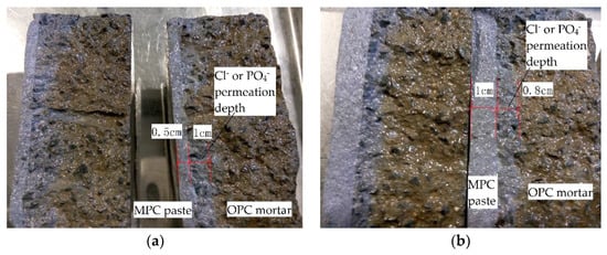The current curves for the MPC paste were similar to those for the MPC mortar. Specifically, the current first increased and then decreased with the power time. The 5 mm MPC paste resulted in a 30% decrease in the current, and the 10 mm paste caused an 80% decrease. When the thickness of the MPC paste varied from 10 to 15 mm, the current decreased slightly. Figure 13 and Figure 14 indicate that the 5, 10, and 15 mm MPC paste caused a decrease in electrical flux by 40.2%, 84.2%, and 88.2%, respectively. The electrical flux of the OPC mortar with 10 mm MPC paste was about 24.5% that of the single MPC mortar and 11.8% that of the single OPC mortar, demonstrating the excellent performance of the MPC paste in resisting chloride icon penetration. The preparation method for specimens with MPC paste was the same as that used for the MPC mortar, with the thickness of MPC paste being 5, 10, and 15 mm, as shown in Figure 15. Similar to the case shown in Figure 12, the white precipitate appearing on the surface of the OPC mortar may be silver chloride precipitation or silver phosphate precipitation. However, compared with Figure 12a, the MPC net pulp coating hindered the chloride ion penetration in OPC mortar.