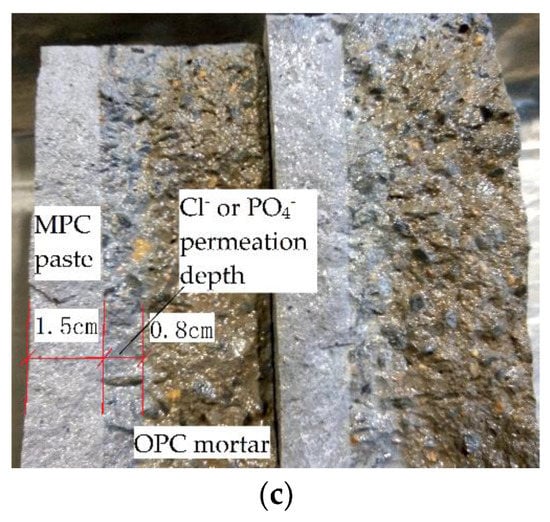 An MPC slurry can be selected as a repair material for deteriorated concrete when limited repair time is needed, e.g., for ridge structures not completely blocking traffic and harbor structures during tidal gaps. An acid–base reaction occurs immediately after the magnesium phosphate cement meets the water, forming binding materials whose strength can reach as high as 40 MPa in 3 h [11]. Under very low temperatures (e.g., −20 °C), this acid–base reaction can still work in MPC cement, making the rapid repair of concrete infrastructure possible in winter. Other advantages of MPC over Portland cement include high bonding strength and low shrinkage [12,13].
