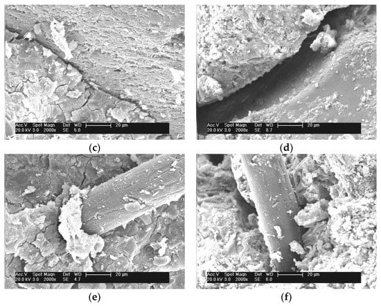 The residual body of a typical specimen was selected for SEM analysis, and the mechanism of resistance to Cl penetration of the MPC material and OPC material was further compared and analyzed. Figure 16a,b illustrates the micromorphology of the MPC slurry and OPC slurry. The hydration products of the MPC cement have a compact, flakey structure and a small gap, while the microstructures of the hydration products of OPC are relatively loose, with a significantly larger pore size than that of the MPC. Figure 16c,d shows the interface morphologies between the cement paste and the aggregate. Obviously, the MPC paste closely combined with the aggregate, and its interface fissure was much smaller than the interface gap between the OPC paste and the aggregate. Figure 16e shows the interface morphology of the MPC paste and PVA fiber, while Figure 16f illustrates that of the OPC paste. The MPC slurry was tightly wrapped around the fiber, while the OPC slurry was not tightly bound to the fiber interface because the slurry was not dense enough. Moreover, the water-to-cement ratio of the MPC mortar was 0.18, while that of the OPC mortar was 0.45. Excessive free water in the OPC mortar is one of the reasons for the mortar’s microstructural shortness. By comprehensively comparing the two, the compactness of the MPC material was shown much better than that of the OPC material. The MPC’s capillary void was much smaller, and its resistance to Cl permeation was better.