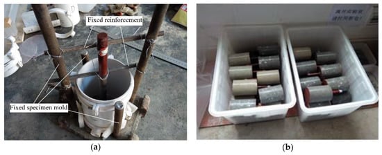The rebar to be measured was fixed by brackets on both sides, as shown in Figure 18a. For the corrosion of round steel bars with Ø10, it was first placed in a 12% hydrochloric acid solution and rinsed with water after neutralization with lime water; then, it was rinsed with water, dried, and stored in a desiccator for at least 4 h. Each component was made according to the ratios shown in Table 4, Table 5 and Table 6. After mixing the mortar, we immediately fabricated the test piece, and each group had a total of three pieces. The mortar samples were released from day 1, and resin seals were applied to the upper and lower bottoms of the specimens. Additionally, silicone rubber seals were used to seal the reinforcement root, thereby ensuring that the erosion medium penetrated from the side of the cylindrical specimen. Then, the specimen was placed under indoor moisture conservation maintenance, as shown in Figure 18b. Next, an accelerated corrosion test was carried out on these specimens after 28 d.